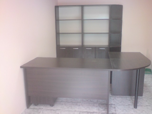 Включва: бюро, помощно бюро, контейнер с 4 чекмеджета, ъглов модул с метален крак, 2 бр. библиотеки с 2/5 врати, ъглова библиотека
